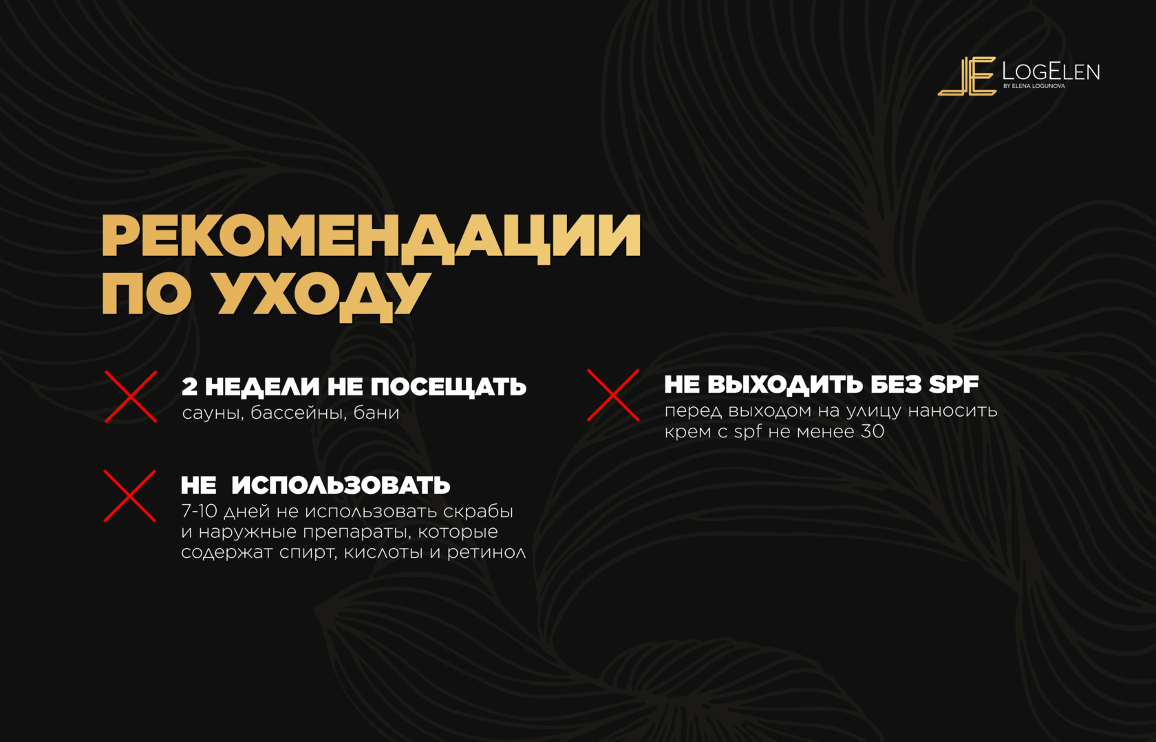 Мы рекомендуем 2 недели не посещать бани, сауны, бассейны и не загорать (перед выходом на улицу наносить крем с SPF не менее 30.